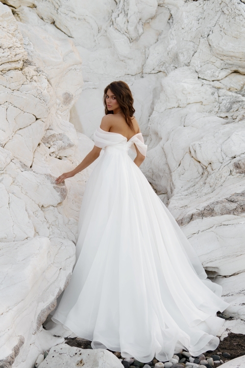 органза — основной материал, из которого исполнено платье, дарит ощущение лёгкости и бесконечного праздника. Минималистичный дизайн этого свадебного наряда составлен из превосходных элементов: дизайнерские драпировки лифа, короткие асимметричные рукова тренда этого сезона